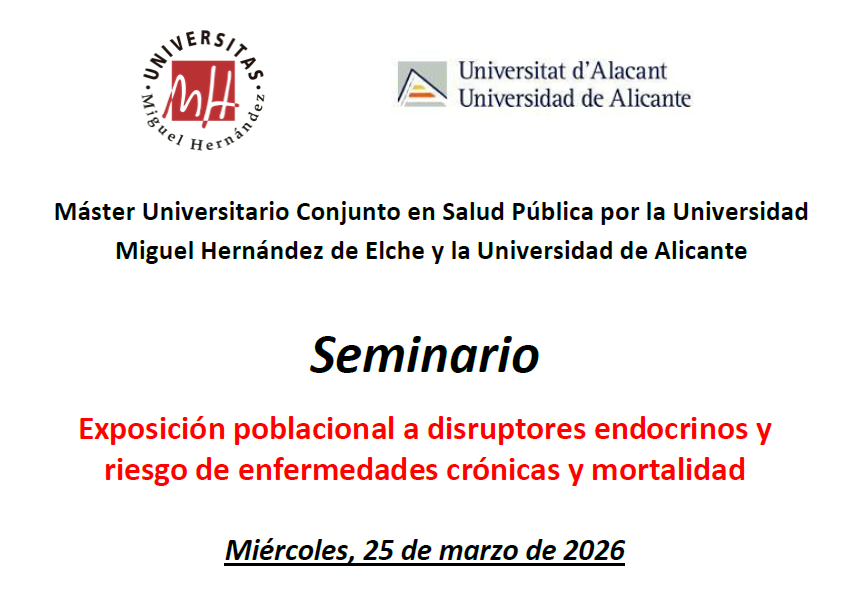 El próximo miércoles, 25 de marzo, de 16:30 a 18:00 se impartirá el Seminario «Exposición poblacional a disruptores endocrinos y riesgo de enfermedades crónicas y mortalidad». El seminario, impartido por la Dr. Vicente Mustieles Miralles, tendrá lugar en el Salón de Grados del Edificio «Fco. Javier Balmis» (campus de Sant Joan)